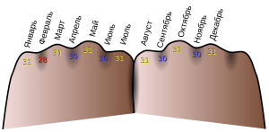 Мнемоническое правило для запоминания количества дней в месяце по костяшкам пальцев.